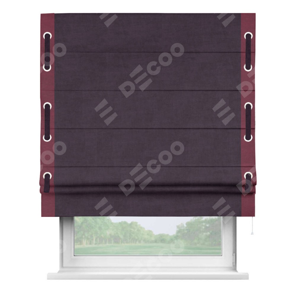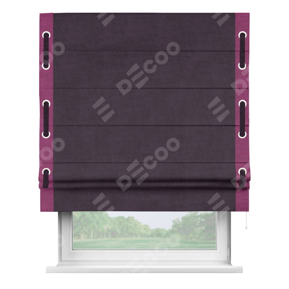 Римская штора «Кортин» для проема, вельвет тёмно-фиолетовый с кантом Стрим Дуо (люверсы с пояском)