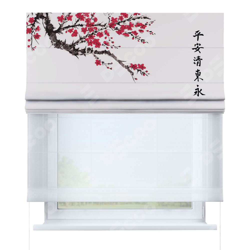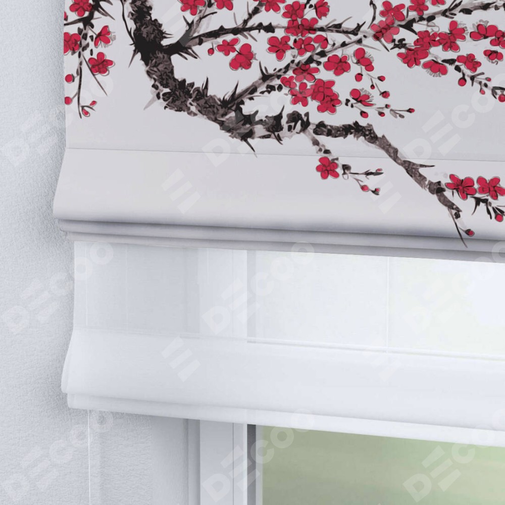 Двойная римская штора «День-ночь» от производителя Cortin предназначена для использования в проёмах. Эта штора уникальна тем, что состоит из двух полотен. На лицевой стороне находится блэкаут с нанесением сублимационной печати «Цветущая сакура», обеспечивающий эффективное затемнение. В комплект также входит вторая ткань — легкий белый тюль (артикул: V-01), который добавляет изящества и легкости оформлению окна. Кроме того, доступны и другие разновидности ткани тюль, выбор которых доступен по ссылке .