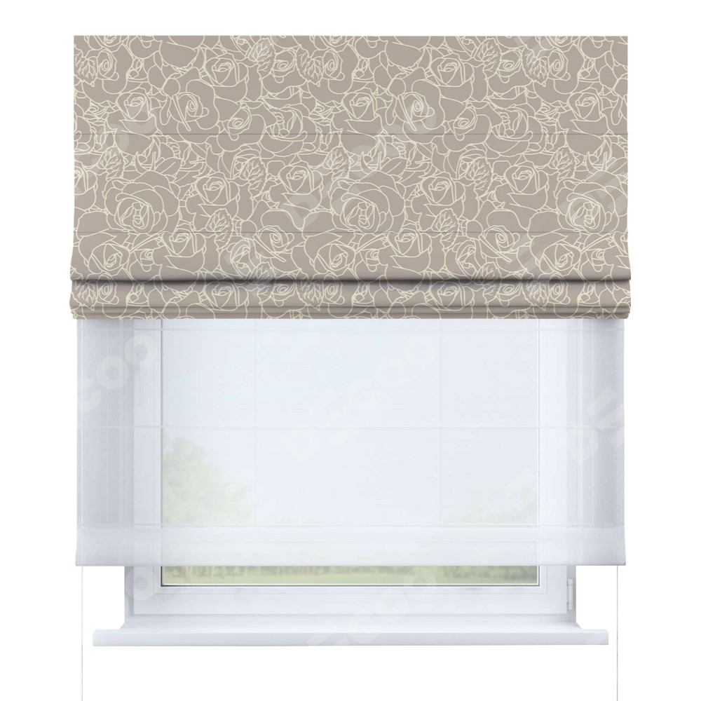 Двойная римская штора «День-ночь» от производителя Cortin предназначена для использования в проёмах. Эта штора уникальна тем, что состоит из двух полотен. На лицевой стороне находится блэкаут с нанесением сублимационной печати «Очарование роз», обеспечивающий эффективное затемнение. В комплект также входит вторая ткань — легкий белый тюль (артикул: V-01), который добавляет изящества и легкости оформлению окна. Кроме того, доступны и другие разновидности ткани тюль, выбор которых доступен по ссылке .