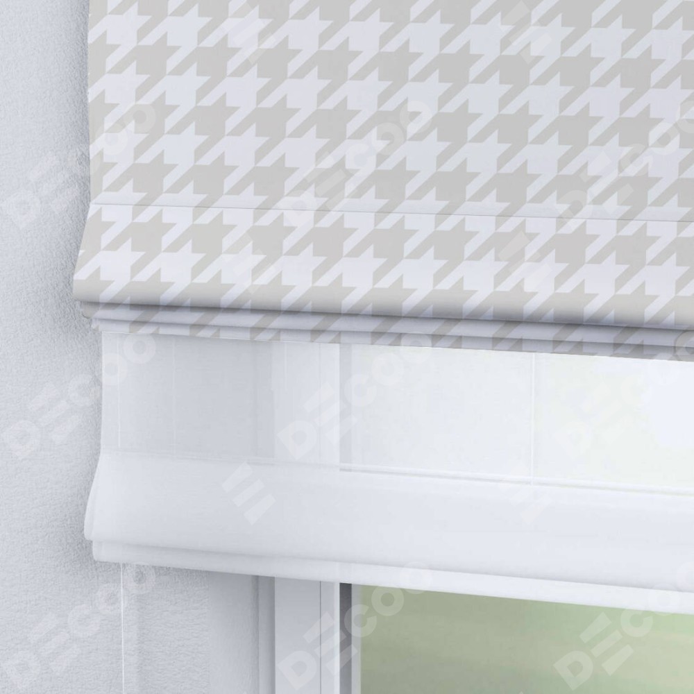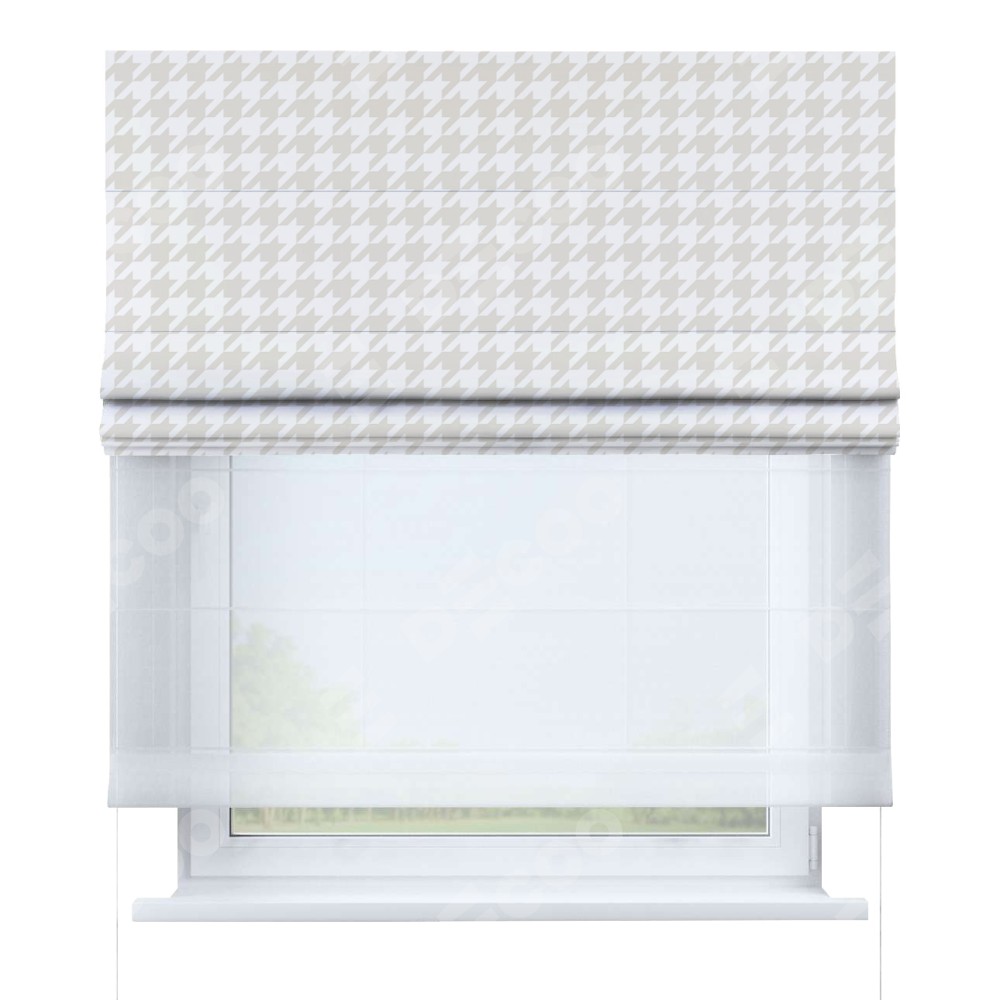 Двойная римская штора «День-ночь» от производителя Cortin предназначена для использования в проёмах. Эта штора уникальна тем, что состоит из двух полотен. На лицевой стороне находится блэкаут с нанесением сублимационной печати «Гусиные лапки» молочный», обеспечивающий эффективное затемнение. В комплект также входит вторая ткань — легкий белый тюль (артикул: V-01), который добавляет изящества и легкости оформлению окна. Кроме того, доступны и другие разновидности ткани тюль, выбор которых доступен по  ссылке .