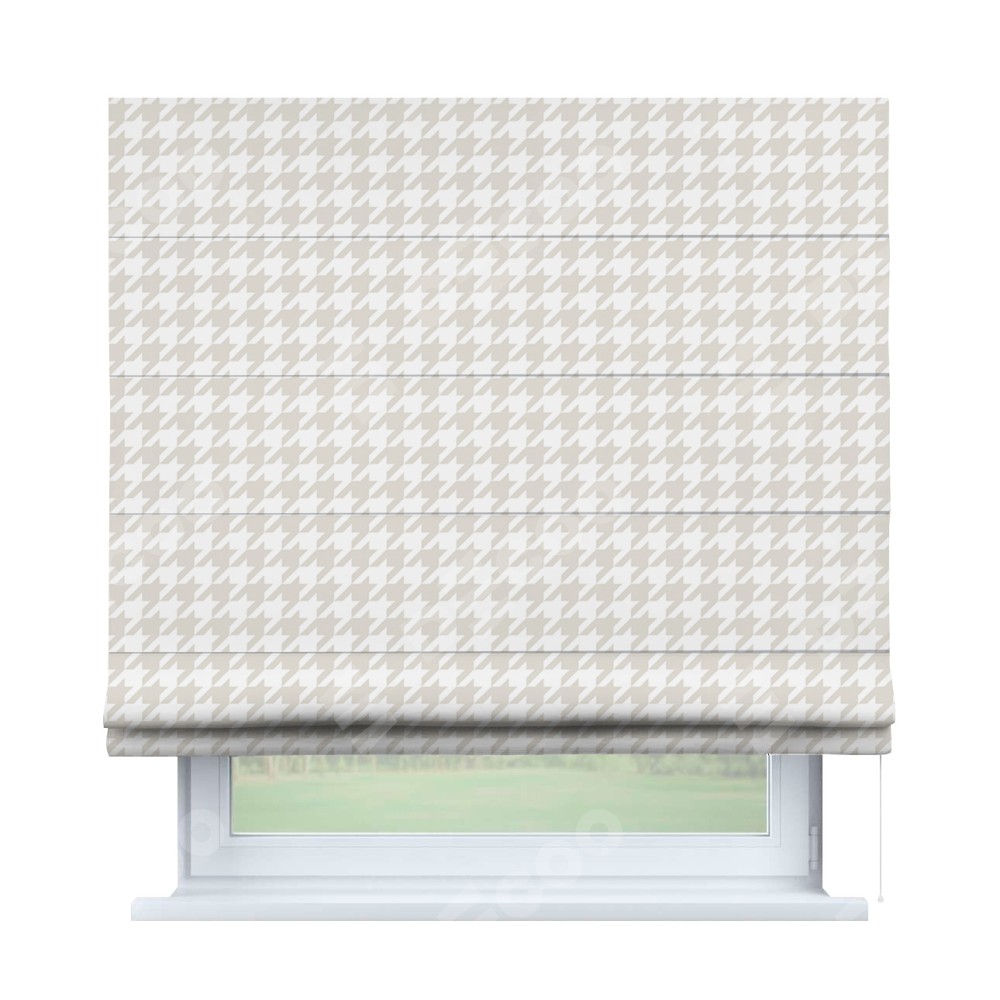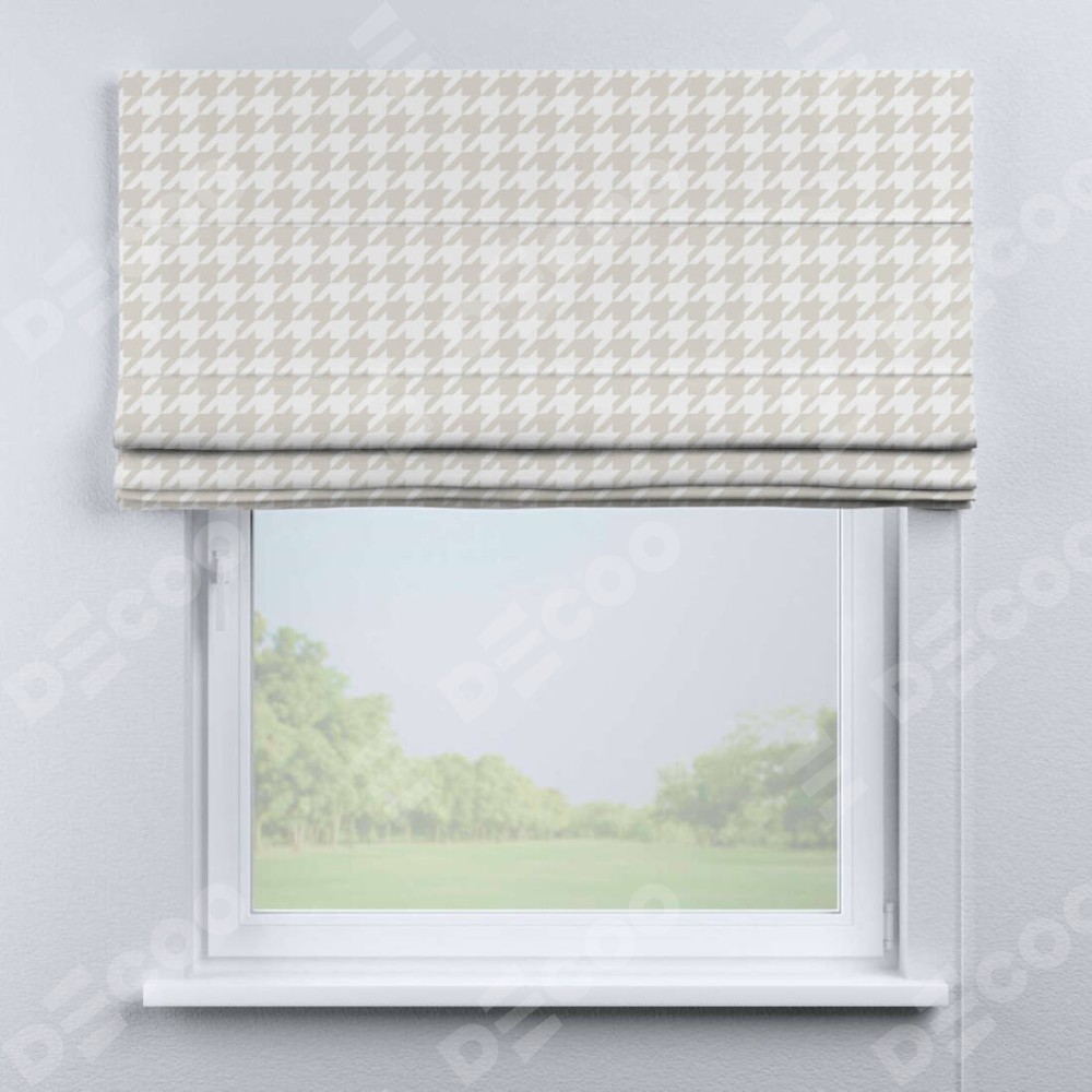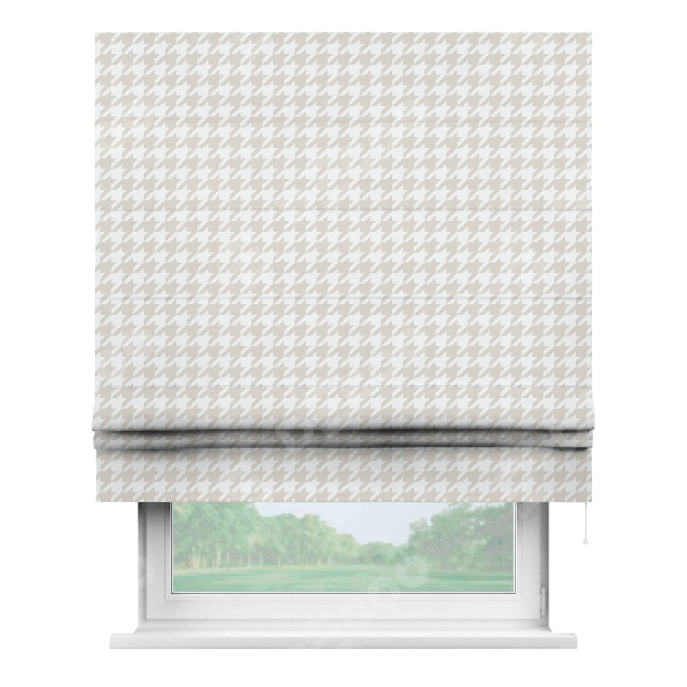 Классическая римская штора производителя «Cortin», пошита из ткани блэкаут с нанесением сублимационной печати «Гусиные лапки» молочный». Имеет универсальный механизм и подходит для монтажа: на потолок, на стену и в нишу.
