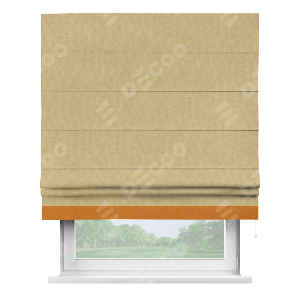 Римская штора производителя «Cortin», используется для проёма, пошита из ткани канвас абрикосовый, артикул ткани v-448. Отделка шторы кантом «Джестер» (оранжевый v-106), ткань для канта используется из канваса разной расцветки на выбор. Имеет универсальный механизм и подходит для монтажа: на потолок, на стену и в нишу.