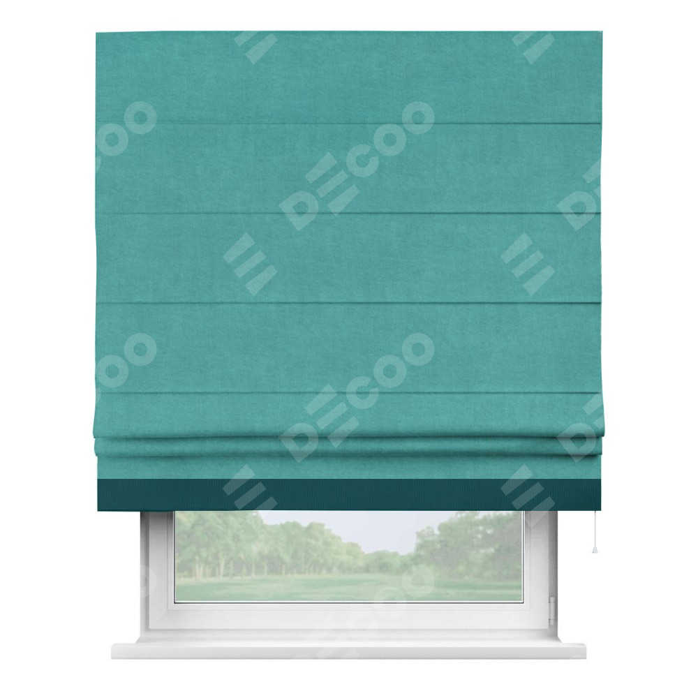 Римская штора производителя «Cortin», используется для проёма, пошита из ткани канвас бирюзовый, артикул ткани v-1048. Отделка шторы кантом «Джестер» (изумрудный v-12487), ткань для канта используется из канваса разной расцветки на выбор. Имеет универсальный механизм и подходит для монтажа: на потолок, на стену и в нишу.