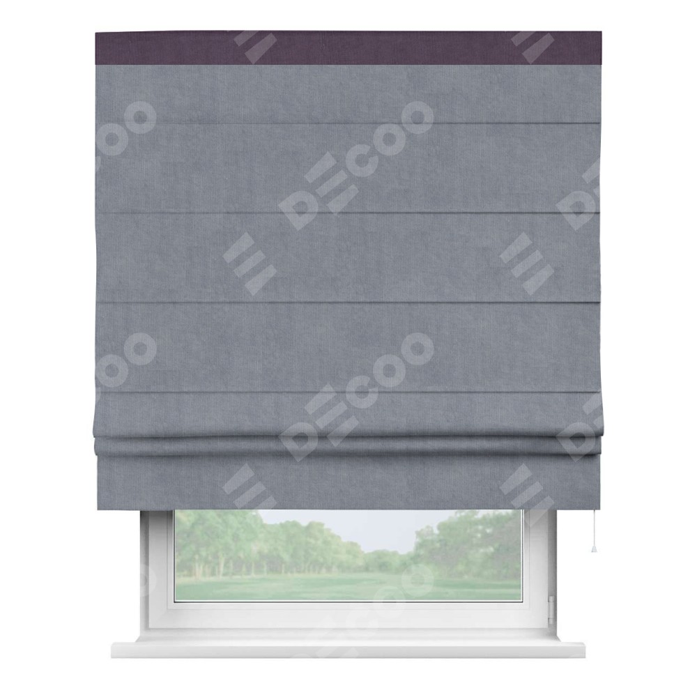 Римская штора производителя «Cortin», используется для проёма, пошита из ткани канвас васильковый, артикул ткани v-203. Отделка шторы кантом «Кинг» (баклажановый v-111), ткань для канта используется из канваса разной расцветки на выбор. Имеет универсальный механизм и подходит для монтажа: на потолок, на стену и в нишу.