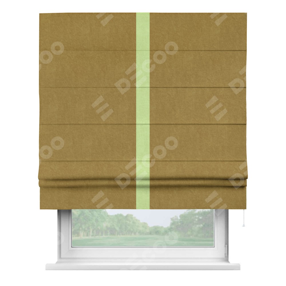 Римская штора производителя «Cortin», используется для проёма, пошита из ткани канвас горчица, артикул ткани v-476. Отделка шторы кантом «Хайвей» (липовый v-207), ткань для канта используется из канваса разной расцветки на выбор. Имеет универсальный механизм и подходит для монтажа: на потолок, на стену и в нишу.