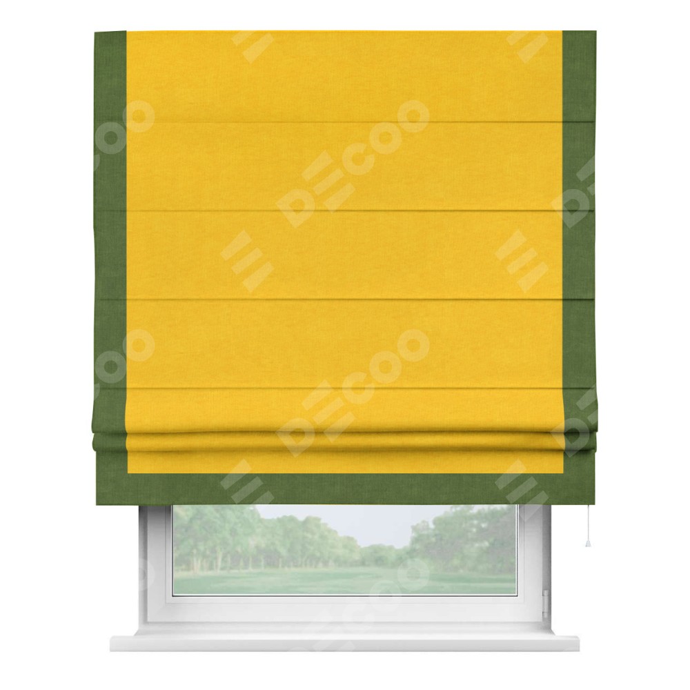 Римская штора производителя «Cortin», используется для проёма, пошита из ткани канвас желтый, артикул ткани v-344. Отделка шторы кантом «Виктория» (трава v-473), ткань для канта используется из канваса разной расцветки на выбор. Имеет универсальный механизм и подходит для монтажа: на потолок, на стену и в нишу.