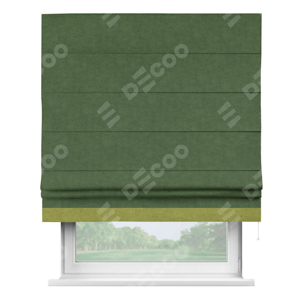 Римская штора производителя «Cortin», используется для проёма, пошита из ткани канвас зелёный, артикул ткани v-16. Отделка шторы кантом «Джестер» (зелёное яблоко v-370), ткань для канта используется из канваса разной расцветки на выбор. Имеет универсальный механизм и подходит для монтажа: на потолок, на стену и в нишу.