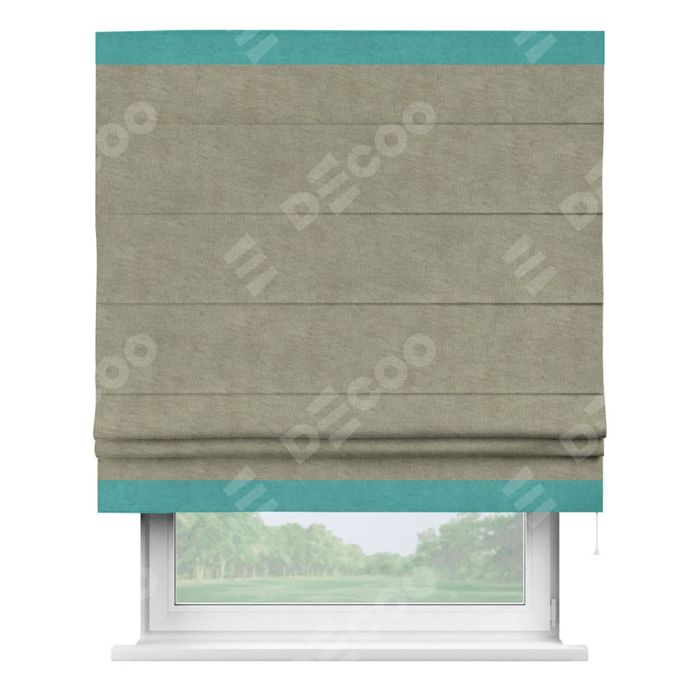 Римская штора производителя «Cortin», используется для проёма, пошита из ткани канвас капучино, артикул ткани v-211. Отделка шторы кантом «Горизонт» (бирюзовый v-1048), ткань для канта используется из канваса разной расцветки на выбор. Имеет универсальный механизм и подходит для монтажа: на потолок, на стену и в нишу.