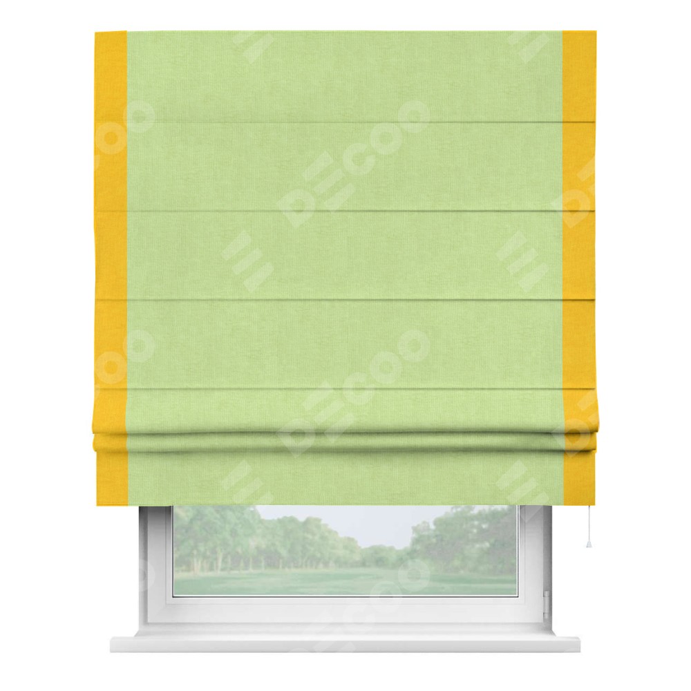 Римская штора производителя «Cortin», используется для проёма, пошита из ткани канвас липовый, артикул ткани v-207. Отделка шторы кантом «Стрим Дуо» (желтый v-344), ткань для канта используется из канваса разной расцветки на выбор. Имеет универсальный механизм и подходит для монтажа: на потолок, на стену и в нишу.