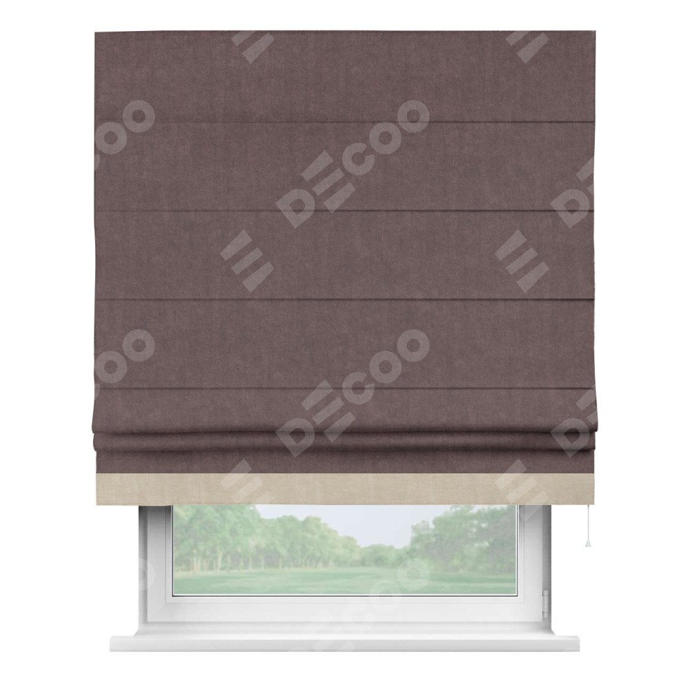 Римская штора производителя «Cortin», используется для проёма, пошита из ткани канвас махагон, артикул ткани v-37. Отделка шторы кантом «Джестер» (шоколадный v-193), ткань для канта используется из канваса разной расцветки на выбор. Имеет универсальный механизм и подходит для монтажа: на потолок, на стену и в нишу.