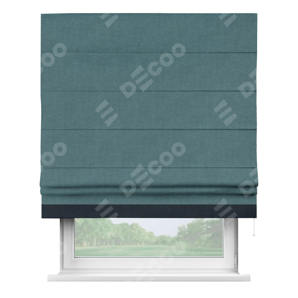 Римская штора производителя «Cortin», используется для проёма, пошита из ткани канвас ментоловый, артикул ткани v-114. Отделка шторы кантом «Джестер» (тёмно-синий v-206), ткань для канта используется из канваса разной расцветки на выбор. Имеет универсальный механизм и подходит для монтажа: на потолок, на стену и в нишу.