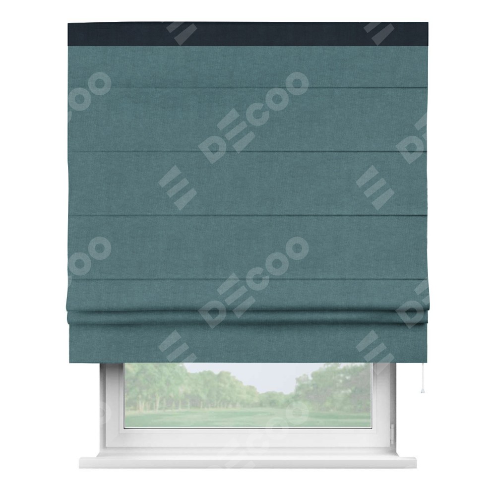 Римская штора производителя «Cortin», используется для проёма, пошита из ткани канвас ментоловый, артикул ткани v-114. Отделка шторы кантом «Кинг» (тёмно-синий v-206), ткань для канта используется из канваса разной расцветки на выбор. Имеет универсальный механизм и подходит для монтажа: на потолок, на стену и в нишу.