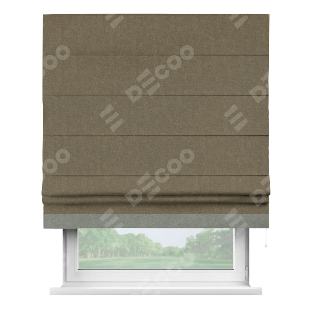 Римская штора производителя «Cortin», используется для проёма, пошита из ткани канвас молочный шоколад, артикул ткани v-08. Отделка шторы кантом «Джестер» (сизый v-1902), ткань для канта используется из канваса разной расцветки на выбор. Имеет универсальный механизм и подходит для монтажа: на потолок, на стену и в нишу.