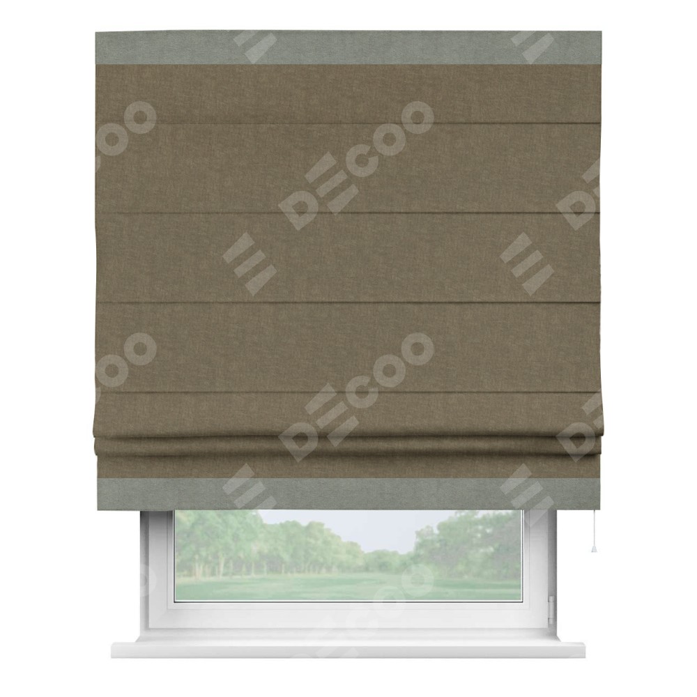 Римская штора производителя «Cortin», используется для проёма, пошита из ткани канвас молочный шоколад, артикул ткани v-08. Отделка шторы кантом «Горизонт» (сизый v-1902), ткань для канта используется из канваса разной расцветки на выбор. Имеет универсальный механизм и подходит для монтажа: на потолок, на стену и в нишу.