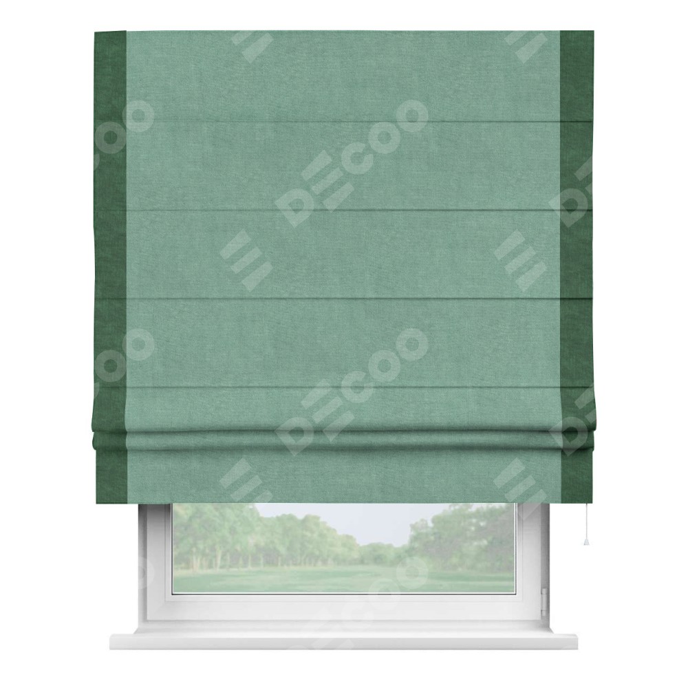Римская штора производителя «Cortin», используется для проёма, пошита из ткани канвас мятный, артикул ткани v-248. Отделка шторы кантом «Стрим Дуо» (тёмно-зелёный v-469), ткань для канта используется из канваса разной расцветки на выбор. Имеет универсальный механизм и подходит для монтажа: на потолок, на стену и в нишу.