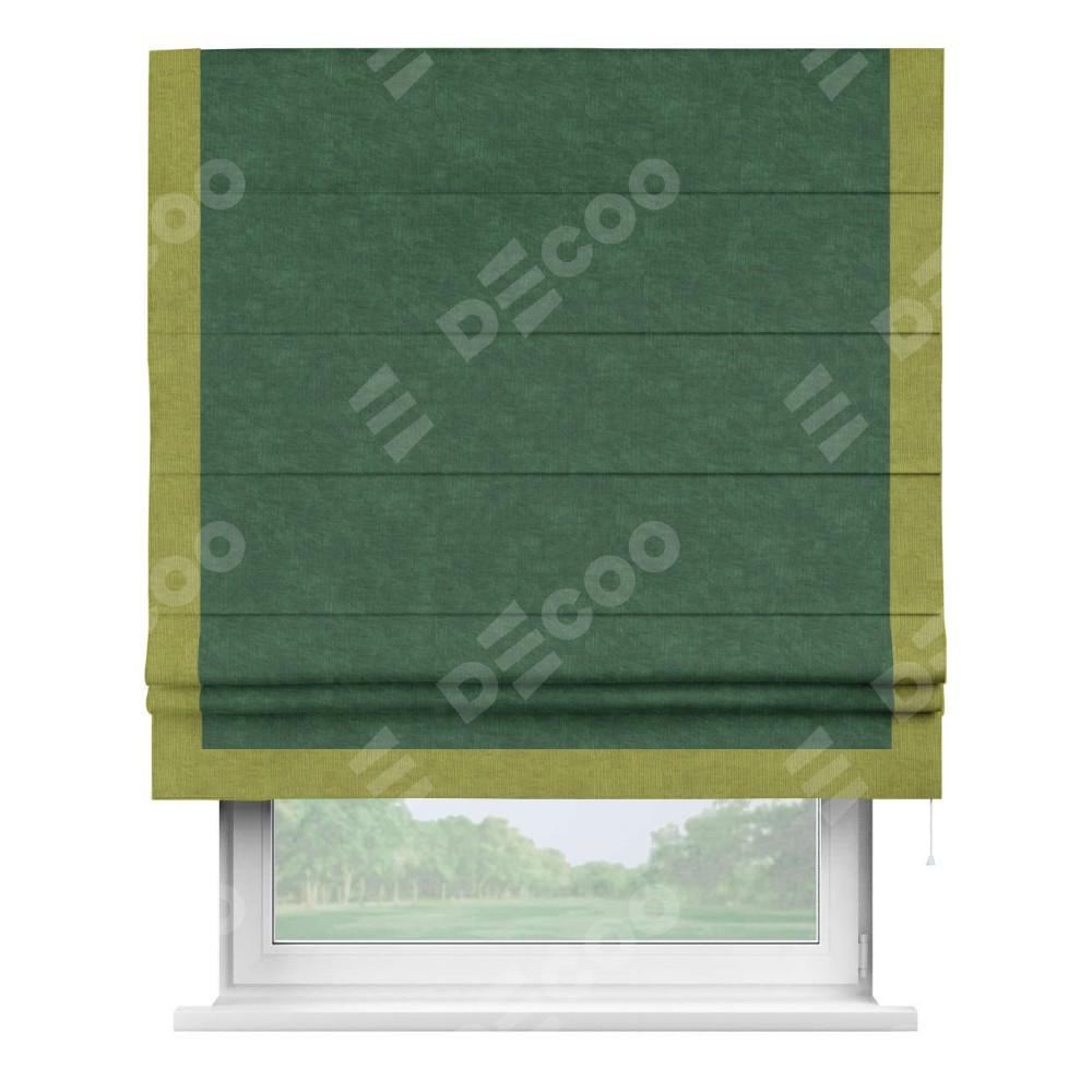 Римская штора производителя «Cortin», используется для проёма, пошита из ткани канвас тёмно-зелёный, артикул ткани v-469. Отделка шторы кантом «Виктория» (зелёное яблоко v-370), ткань для канта используется из канваса разной расцветки на выбор. Имеет универсальный механизм и подходит для монтажа: на потолок, на стену и в нишу.