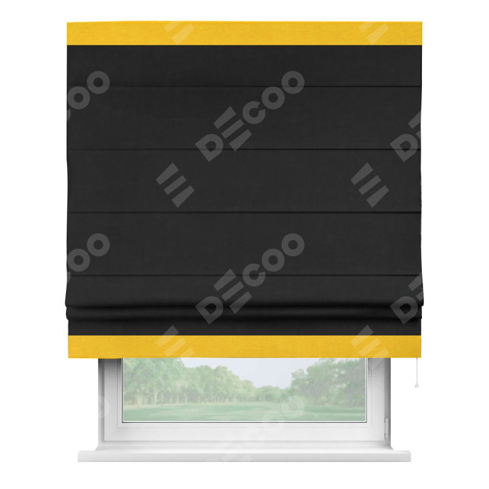 Римская штора производителя «Cortin», используется для проёма, пошита из ткани канвас черный, артикул ткани v-194. Отделка шторы кантом «Горизонт» (желтый v-344), ткань для канта используется из канваса разной расцветки на выбор. Имеет универсальный механизм и подходит для монтажа: на потолок, на стену и в нишу.