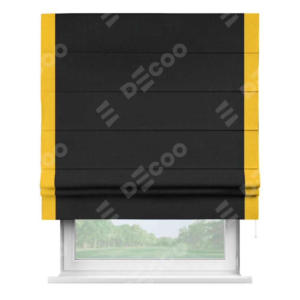 Римская штора производителя «Cortin», используется для проёма, пошита из ткани канвас черный, артикул ткани v-194. Отделка шторы кантом «Стрим Дуо» (желтый v-344), ткань для канта используется из канваса разной расцветки на выбор. Имеет универсальный механизм и подходит для монтажа: на потолок, на стену и в нишу.