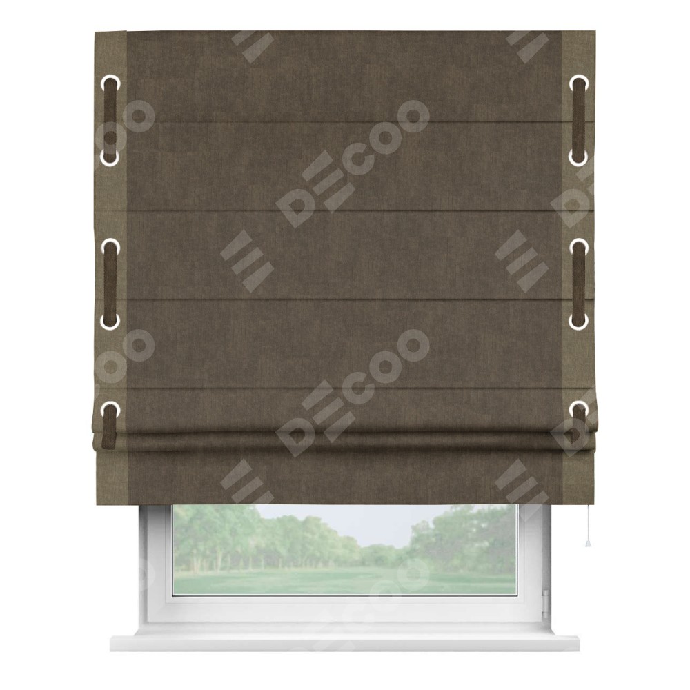 Римская штора производителя «Cortin», используется для проёма, пошита из ткани канвас шоколадный, артикул ткани v-193. Отделка шторы кантом «Стрим Дуо» (молочный шоколад v-08) на кантах расположены люверсы с пояском, ткань для канта используется из канваса разной расцветки на выбор. Ткань для пояска обычно используется из основной ткани шторы, а так же можно сделать из любой расцветки по желанию. Имеет универсальный механизм и подходит для монтажа: на потолок, на стену и в нишу.