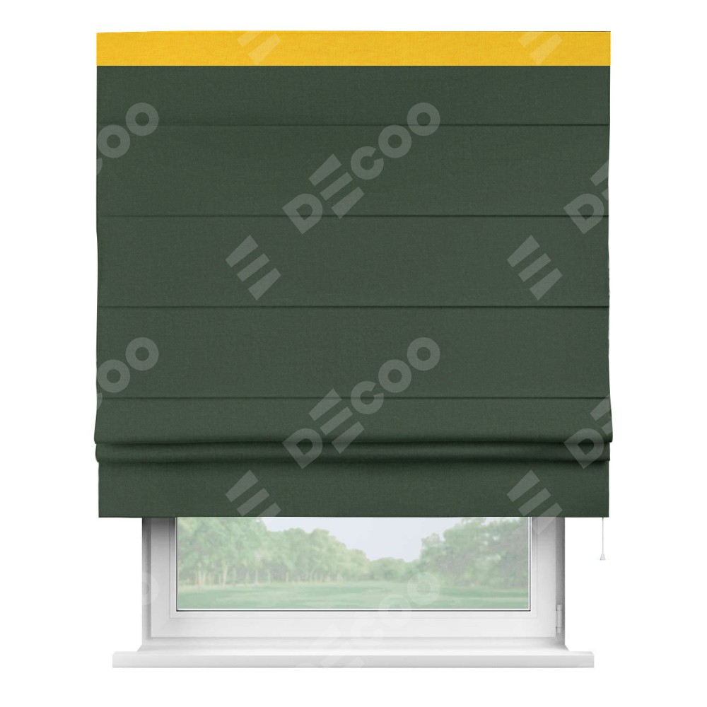 Римская штора производителя «Cortin», используется для проёма, пошита из ткани канвас глубокий зелёный, артикул ткани v-588. Отделка шторы кантом «Кинг» (желтый v-344), ткань для канта используется из канваса разной расцветки на выбор. Имеет универсальный механизм и подходит для монтажа: на потолок, на стену и в нишу.