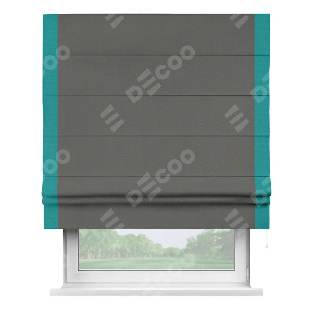 Римская штора производителя «Cortin», используется для проёма, пошита из ткани блэкаут однотонный тёмно-серый, артикул ткани 91570. Отделка шторы кантом «Стрим Дуо», ткань для канта используется из блэкаута однотонного разной расцветки на выбор. Имеет универсальный механизм и подходит для монтажа: на потолок, на стену и в нишу.