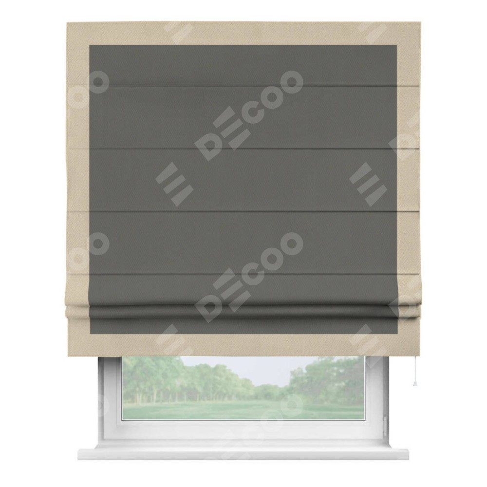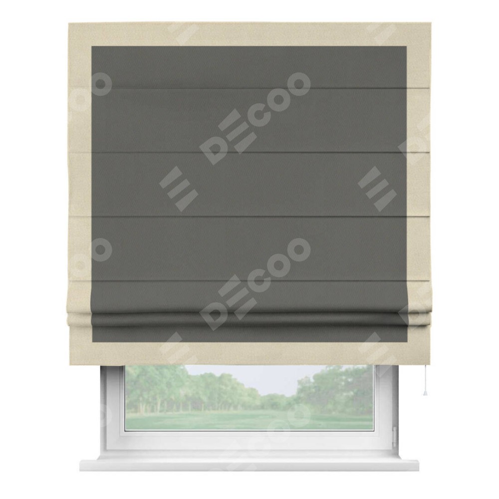 Римская штора производителя «Cortin», используется для проёма, пошита из ткани блэкаут однотонный тёмно-серый, артикул ткани 91570. Отделка шторы кантом «Чесс», ткань для канта используется из блэкаута однотонного разной расцветки на выбор. Имеет универсальный механизм и подходит для монтажа: на потолок, на стену и в нишу.