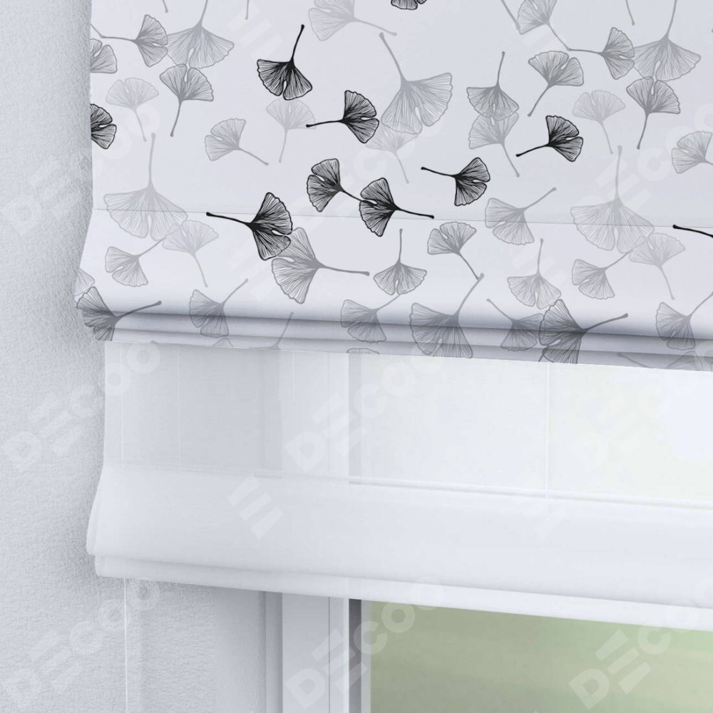 Двойная римская штора «День-ночь» от производителя Cortin предназначена для использования в проёмах. Эта штора уникальна тем, что состоит из двух полотен. На лицевой стороне находится блэкаут с нанесением сублимационной печати «Дымчатые листочки», обеспечивающий эффективное затемнение. В комплект также входит вторая ткань — легкий белый тюль (артикул: V-01), который добавляет изящества и легкости оформлению окна. Кроме того, доступны и другие разновидности ткани тюль, выбор которых доступен по ссылке .