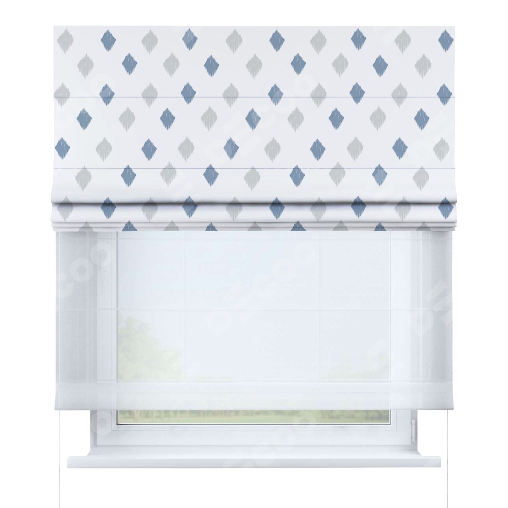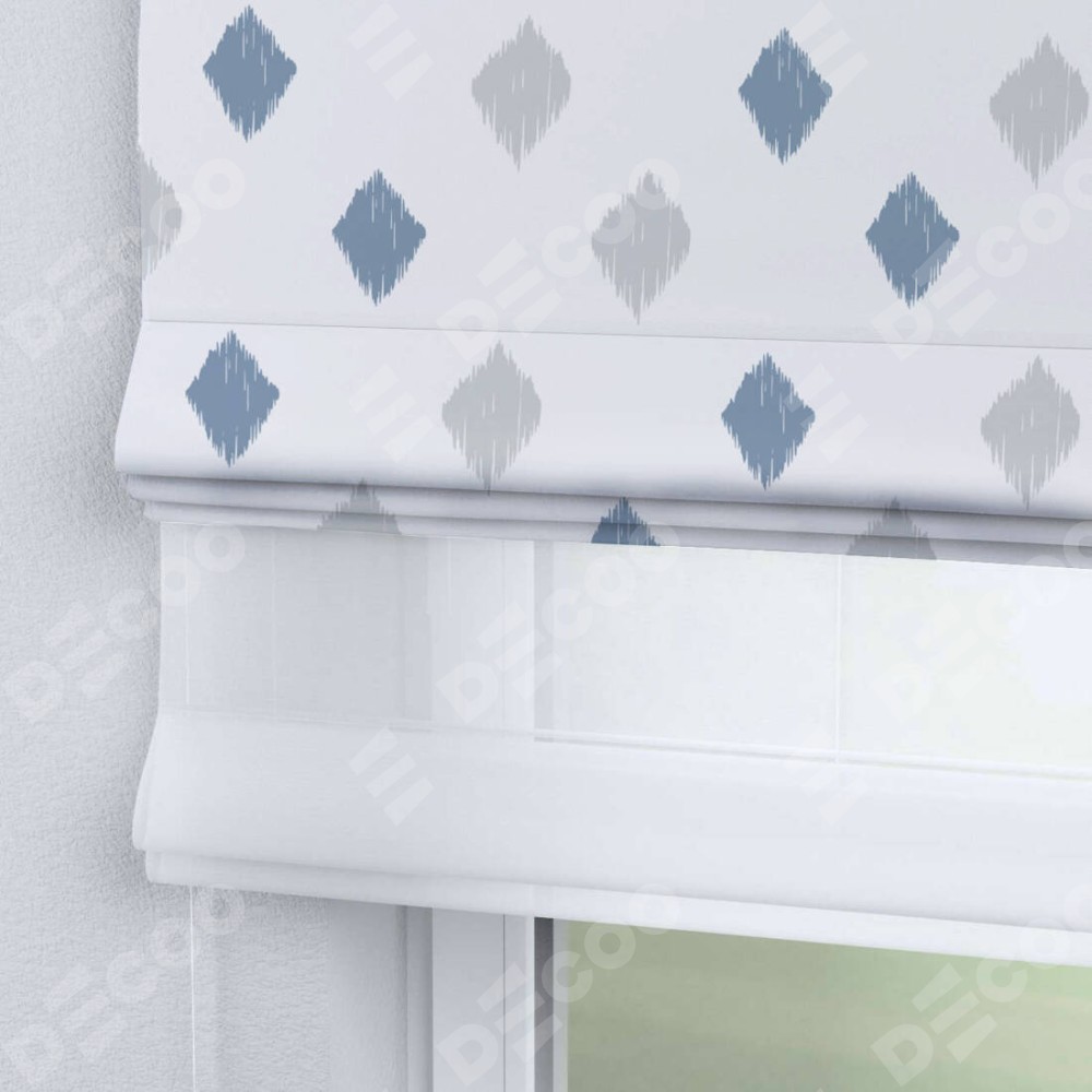 Двойная римская штора «День-ночь» от производителя Cortin предназначена для использования в проёмах. Эта штора уникальна тем, что состоит из двух полотен. На лицевой стороне находится блэкаут с нанесением сублимационной печати «Икат ромбики», обеспечивающий эффективное затемнение. В комплект также входит вторая ткань — легкий белый тюль (артикул: V-01), который добавляет изящества и легкости оформлению окна. Кроме того, доступны и другие разновидности ткани тюль, выбор которых доступен по ссылке .
