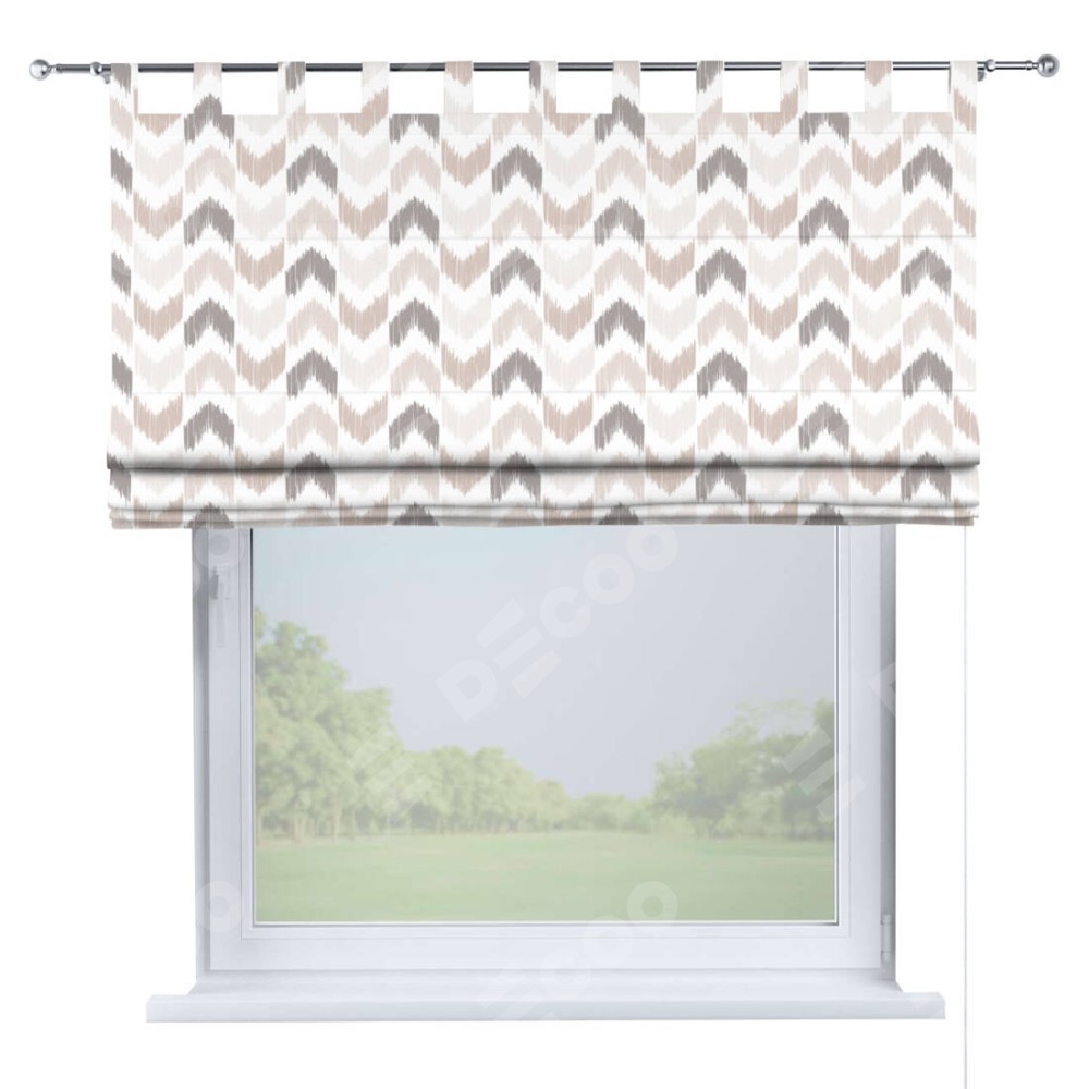 Римская штора производителя «Cortin», используется для проёма, пошита из ткани блэкаут с нанесением сублимационной печати «Икат стрелки». Данная модель пошита на петлях, комплектуется на выбор круглым карнизом и подходит для монтажа на стену. Римская штора на петлях имеет простую систему регулировки высоты, отличительным преимуществом данной модели является простой способ монтажа. Достаточно повесить ее на трубу и штора готова!