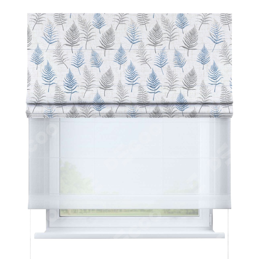 Двойная римская штора «День-ночь» от производителя Cortin предназначена для использования в проёмах. Эта штора уникальна тем, что состоит из двух полотен. На лицевой стороне находится блэкаут с нанесением сублимационной печати «Королевский папоротник», обеспечивающий эффективное затемнение. В комплект также входит вторая ткань — легкий белый тюль (артикул: V-01), который добавляет изящества и легкости оформлению окна. Кроме того, доступны и другие разновидности ткани тюль, выбор которых доступен по ссылке .
