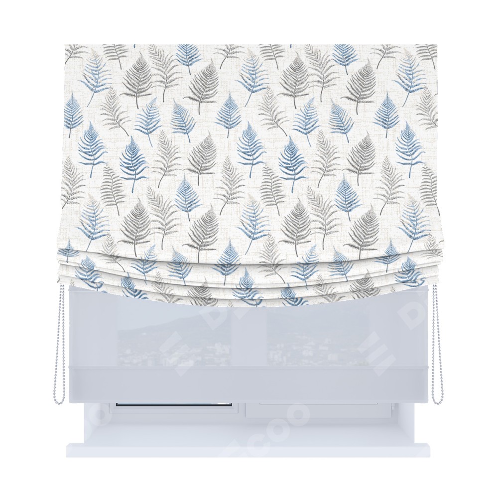Римская штора день-ночь производителя «Cortin», используется для проёма, пошита из двух полотен, с лицевой блэкаут с нанесением сублимационной печати «Королевский папоротник», вторая ткань тюль (по стандарту комплектуется тюль белого цвета артикул V-01). Имеет универсальный механизм и подходит для монтажа: на потолок, на стену и в нишу. Удобное управление каждой шторой отдельно.