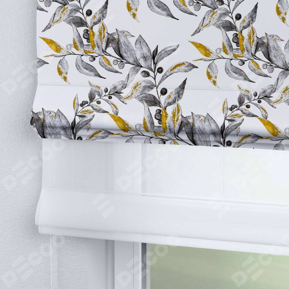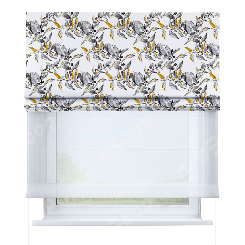 Двойная римская штора «День-ночь» от производителя Cortin предназначена для использования в проёмах. Эта штора уникальна тем, что состоит из двух полотен. На лицевой стороне находится блэкаут с нанесением сублимационной печати «Оливковое дерево», обеспечивающий эффективное затемнение. В комплект также входит вторая ткань — легкий белый тюль (артикул: V-01), который добавляет изящества и легкости оформлению окна. Кроме того, доступны и другие разновидности ткани тюль, выбор которых доступен по  ссылке .