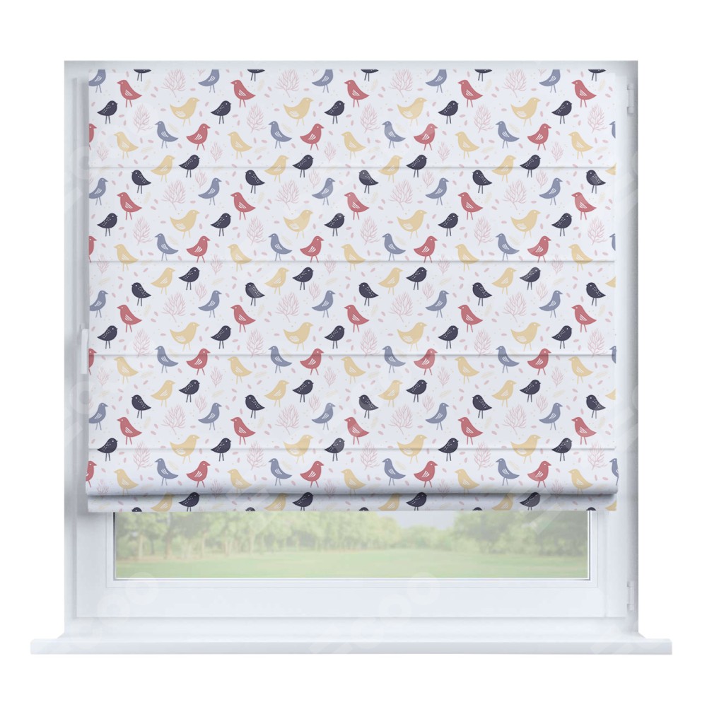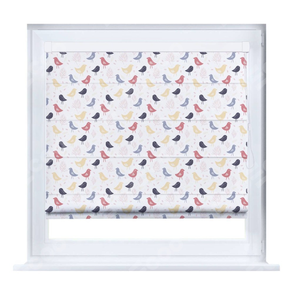 Римская штора производителя «Cortin», устанавливается на створку окна, пошита из ткани блэкаут с нанесением сублимационной печати «Цветные птички». Штора шьётся по индивидуальным размерам, для данного типа римской шторы возможная ширина от 35 до 150 см., высота до 250 см.