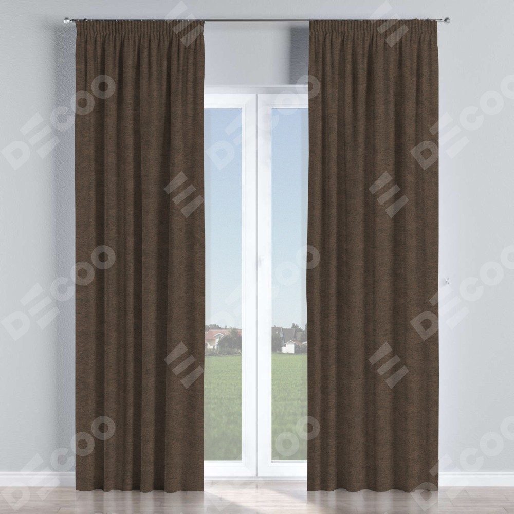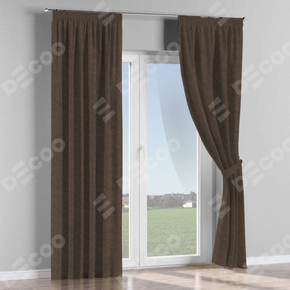 Комплект прямых штор, от производителя «Cortin», пошиты из ткани твид блэкаут тёмно-коричневый, артикул ткани 90933. С изнаночной стороны в верхней части штор пристрачивается шторная лента с декоративными складками «Карандаш». Для создания элегантных складок прямые шторы шьются по стандарту с коэффициентом 1:2 (на 100 см. ширины проёма 200 см. ширины ткани).