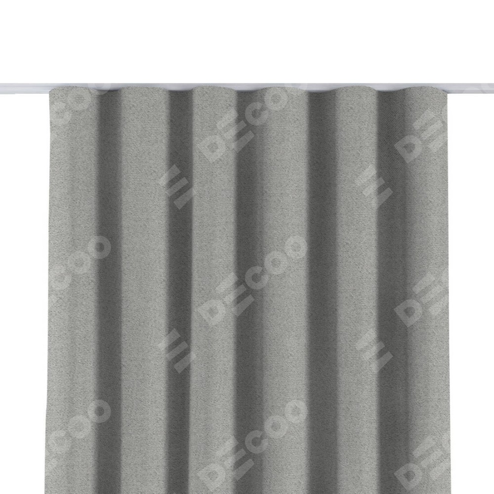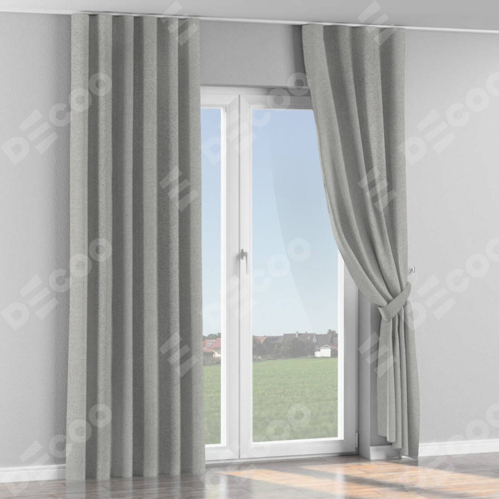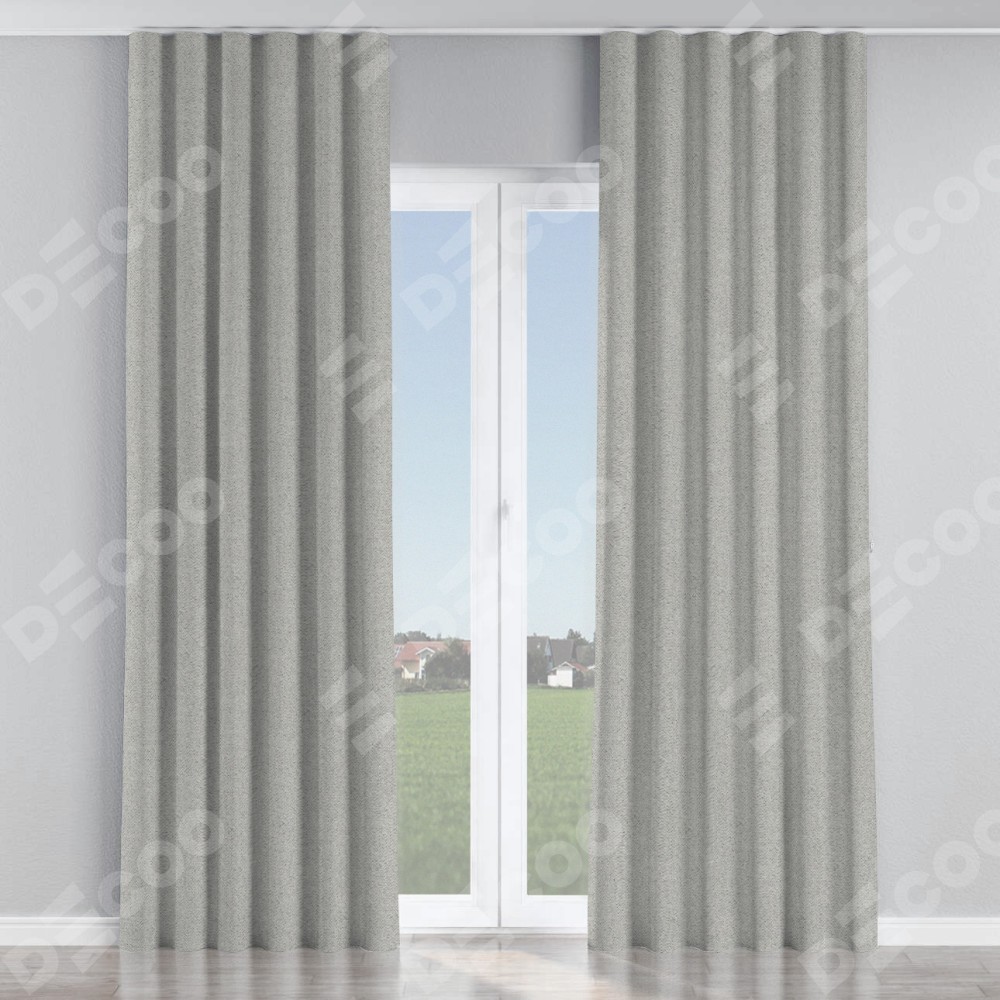 Комплект прямых штор, от производителя «Cortin», пошиты из ткани твид блэкаут светло-серый, артикул ткани 90936. С изнаночной стороны в верхней части штор пристрачивается шторная лента с декоративными складками «Волна». Для создания элегантных складок прямые шторы шьются по стандарту с коэффициентом 1:2 (на 100 см. ширины проёма 200 см. ширины ткани).