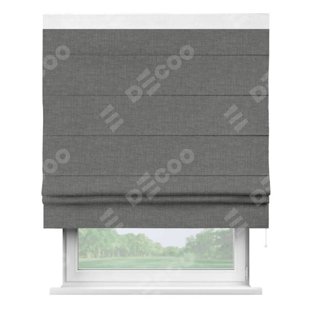 Римская штора производителя «Cortin», используется для проёма, пошита из ткани лён тёмно-серый, артикул 7441. Отделка шторы кантом «Кинг», ткань для канта используется из льна разной расцветки на выбор. Имеет универсальный механизм и подходит для монтажа: на потолок, на стену и в нишу.