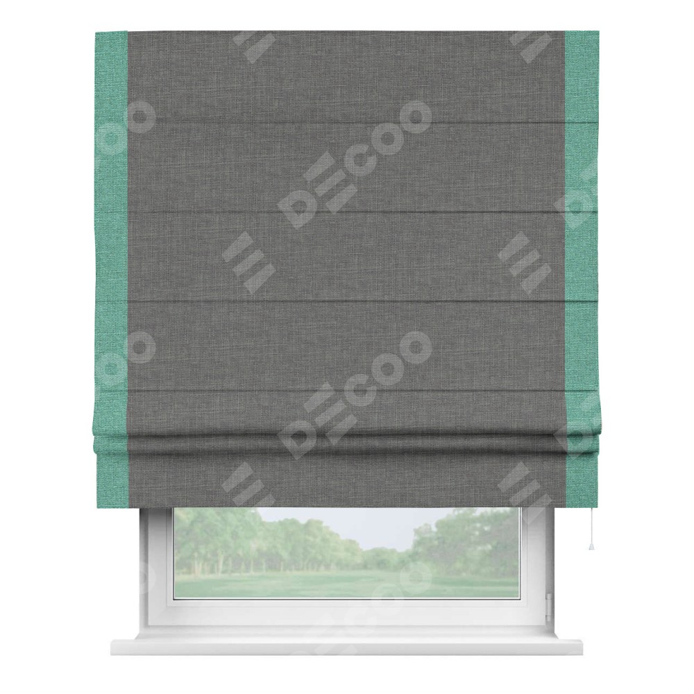 Римская штора производителя «Cortin», используется для проёма, пошита из ткани лён тёмно-серый, артикул 7441. Отделка шторы кантом «Стрим Дуо», ткань для канта используется из льна разной расцветки на выбор. Имеет универсальный механизм и подходит для монтажа: на потолок, на стену и в нишу.