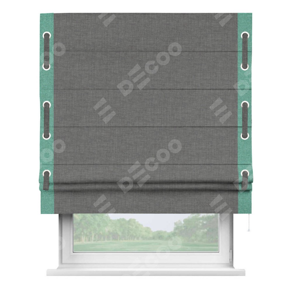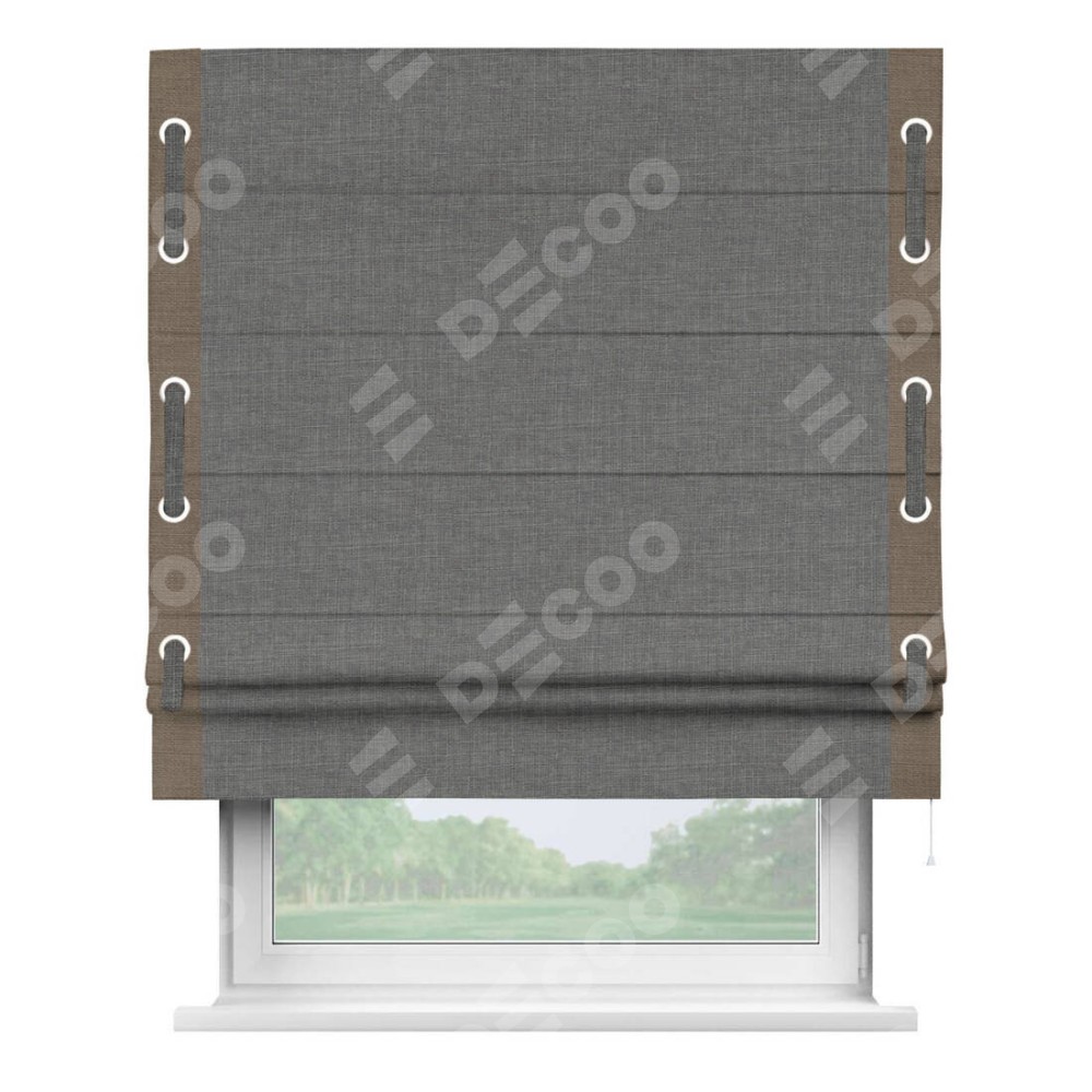 Римская штора производителя «Cortin», используется для проёма, пошита из ткани лён тёмно-серый, артикул 7441. Отделка шторы кантом «Стрим Дуо» на кантах расположены люверсы с пояском, ткань для канта используется из льна разной расцветки на выбор. Ткань для пояска обычно используется из основной ткани шторы, а так же можно сделать из любой расцветки по желанию. Имеет универсальный механизм и подходит для монтажа: на потолок, на стену и в нишу.