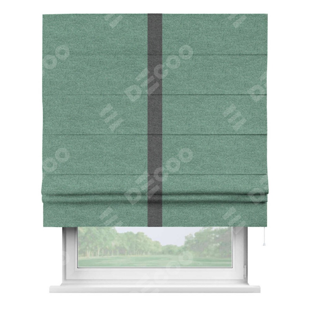 Римская штора производителя «Cortin», используется для проёма, пошита из ткани твид блэкаут бирюзовый, артикул 90934. Отделка шторы кантом «Хайвэй», ткань для канта используется из твида разной расцветки на выбор. Имеет универсальный механизм и подходит для монтажа: на потолок, на стену и в нишу.