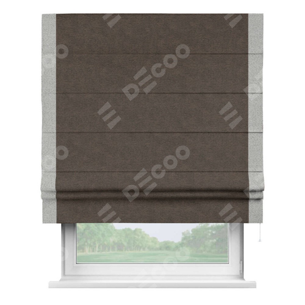 Римская штора производителя «Cortin», используется для проёма, пошита из ткани твид блэкаут тёмно-коричневый, артикул 90933. Отделка шторы кантом «Стрим Дуо», ткань для канта используется из твида разной расцветки на выбор. Имеет универсальный механизм и подходит для монтажа: на потолок, на стену и в нишу.