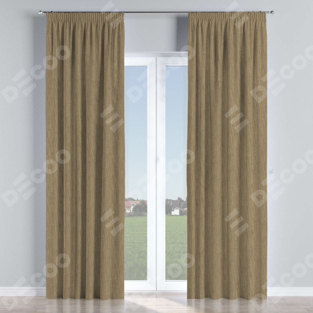 Комплект прямых штор, от производителя «Cortin», пошиты из ткани лён димаут тёмно-бежевый, артикул ткани 16261. С изнаночной стороны в верхней части штор пристрачивается шторная лента с декоративными складками «Карандаш». Для создания элегантных складок прямые шторы шьются по стандарту с коэффициентом 1:2 (на 100 см. ширины проёма 200 см. ширины ткани).