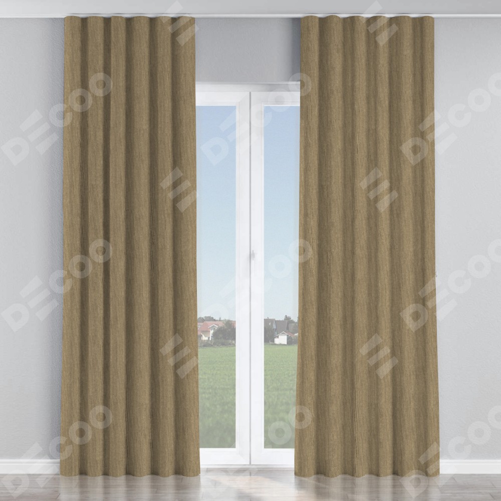 Комплект прямых штор, от производителя «Cortin», пошиты из ткани лён димаут тёмно-бежевый, артикул ткани 16261. С изнаночной стороны в верхней части штор пристрачивается шторная лента с декоративными складками «Волна». Для создания элегантных складок прямые шторы шьются по стандарту с коэффициентом 1:2 (на 100 см. ширины проёма 200 см. ширины ткани).