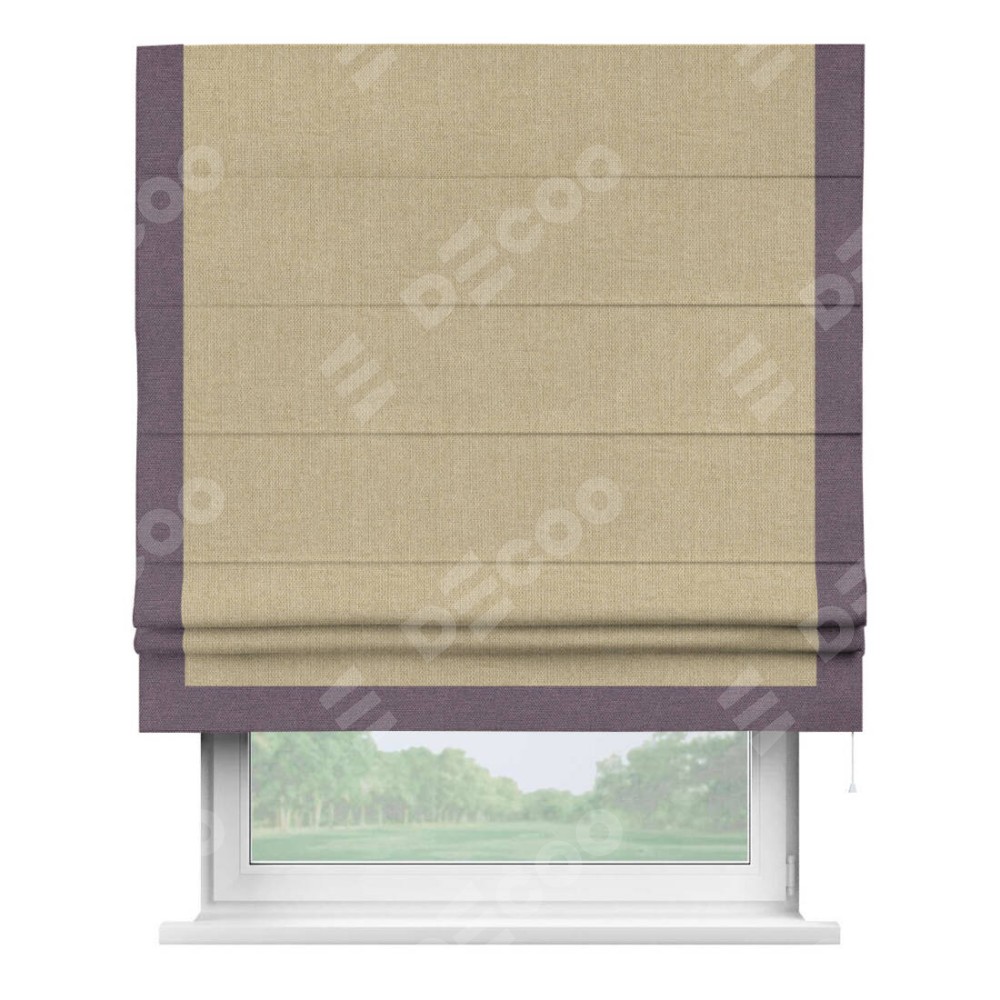 Римская штора с отделкой кантом «Виктория», пошита из ткани лён димаут песочный, артикул: 16256. представляет собой элегантное решение для оконного оформления. Кант по бокам и снизу шторы добавляет изысканности и аккуратности внешнему виду, подчеркивая линии и форму шторы. Этот элемент декора не только украшает, но и выполняет практическую функцию, защищая края ткани от износа. Кант может быть выполнен в контрастном или гармонирующем цвете, что позволяет добиться различных стилевых эффектов и легко вписать штору в интерьер комнаты.