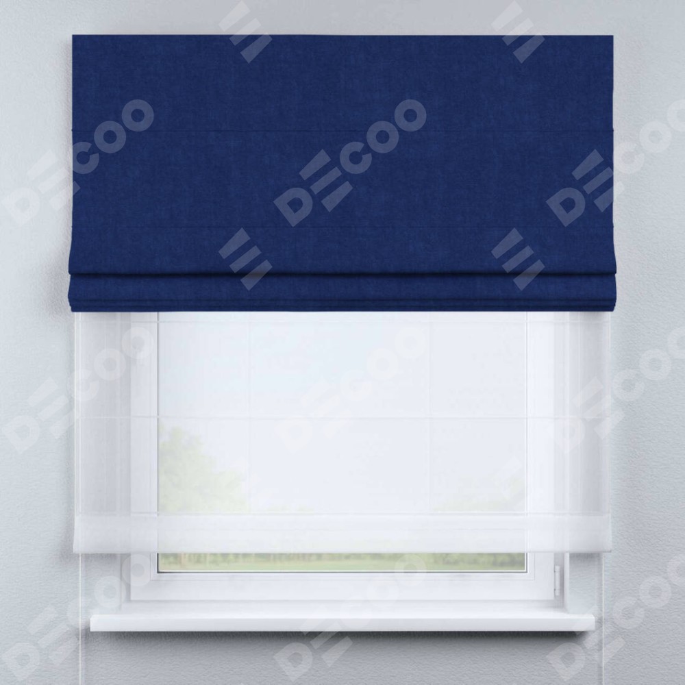 Двойная римская штора «День-ночь» от производителя Cortin предназначена для использования в проёмах. Эта штора уникальна тем, что состоит из двух полотен. На лицевой стороне находится канвас синий электрик (артикул: v-355), обеспечивающий мягкое затемнение. В комплект также входит вторая ткань — легкий белый тюль (артикул: V-01), который добавляет изящества и легкости оформлению окна. Кроме того, доступны и другие разновидности ткани тюль, выбор которых доступен по ссылке .