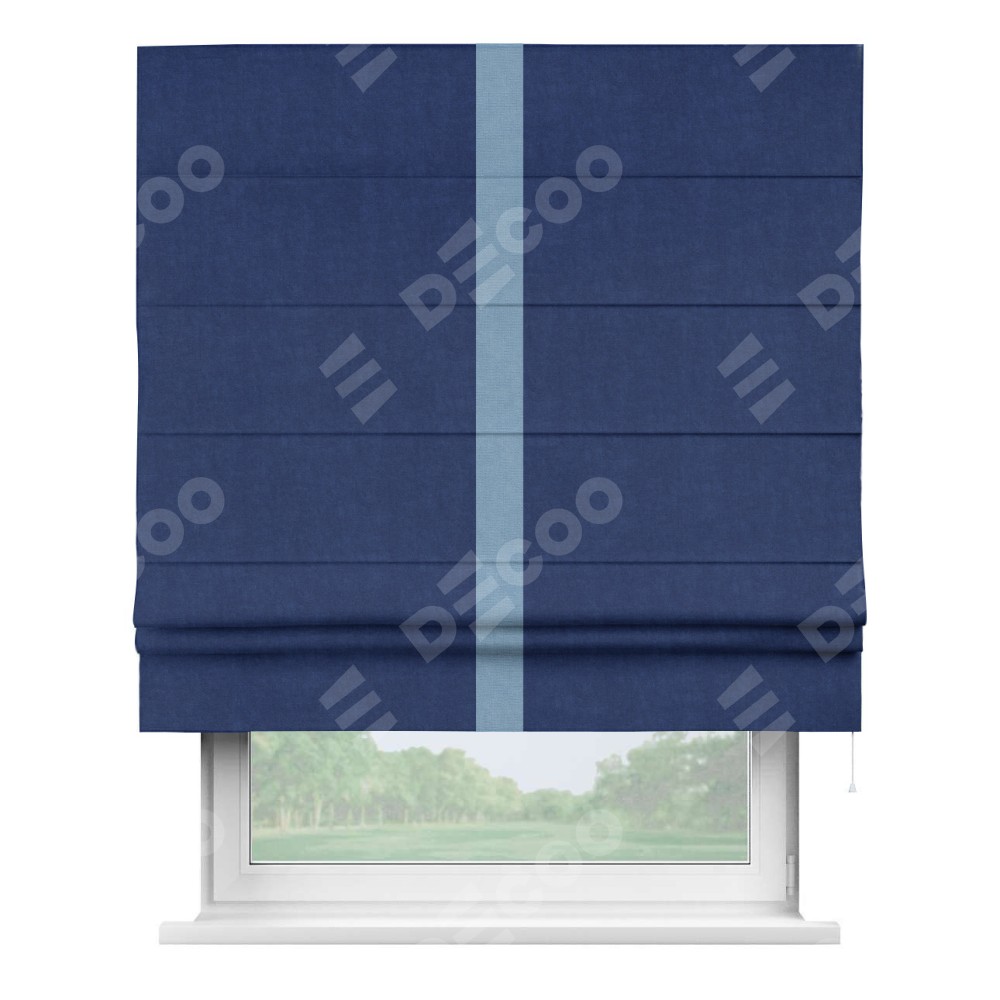 Римская штора пошита из ткани канвас синий электрик, артикул: v-355, с отделкой кантом «Хайвэй» представляет собой уникальное и смелое дизайнерское решение, где кант расположен вертикально посередине шторы. Этот дизайн не только выделяет штору среди других вариантов оформления окон, но и создает интересный визуальный акцент, привлекая внимание к центру окна и разделяя штору на визуальные зоны. Такой нестандартный подход добавляет динамичности интерьеру и может быть использован для подчеркивания особенностей оформления помещения.