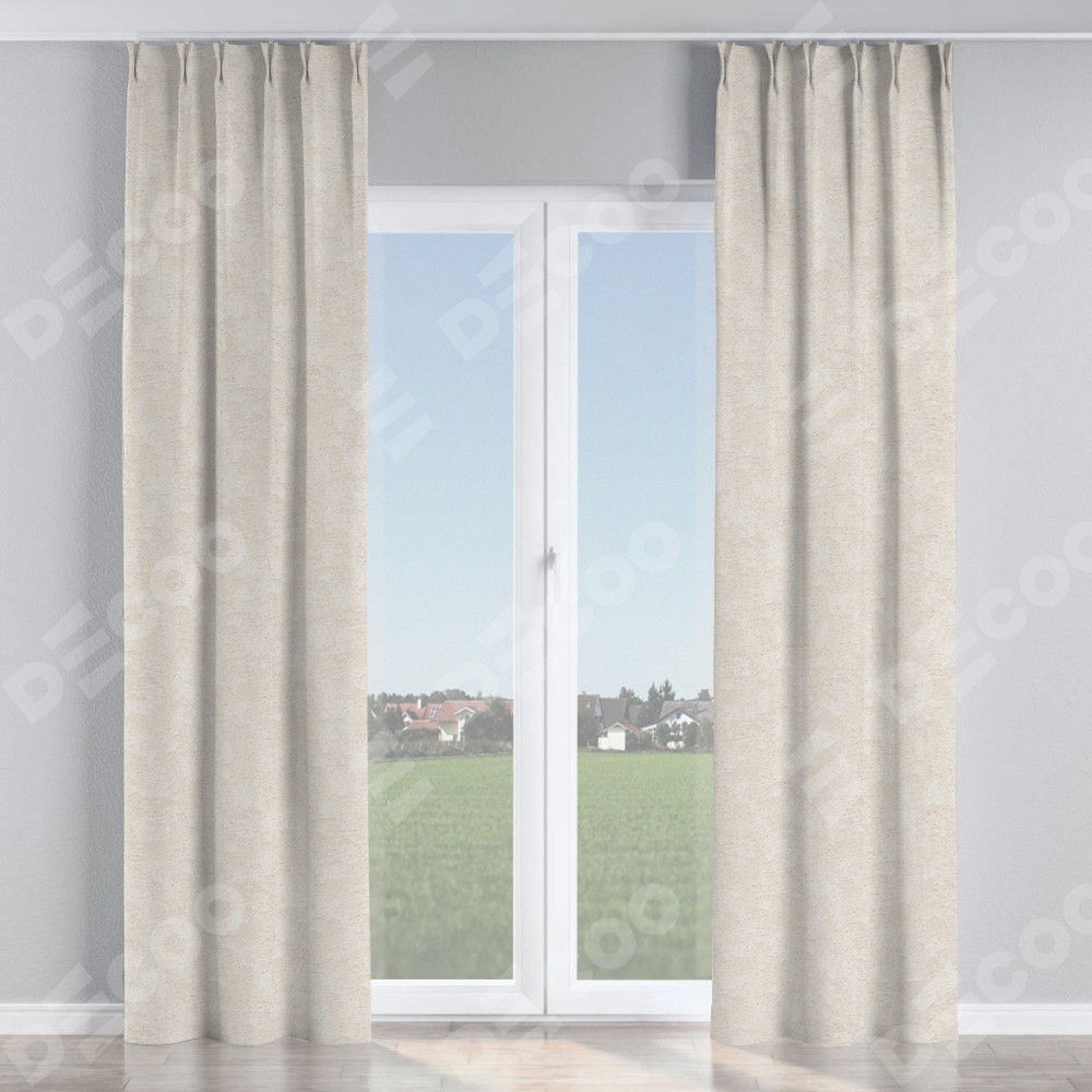 Комплект прямых штор, от производителя «Cortin», пошиты из ткани софт мрамор кремовый, артикул ткани 93574. С изнаночной стороны в верхней части штор пристрачивается шторная лента с декоративными складками «Кустик». Для создания элегантных складок прямые шторы шьются по стандарту с коэффициентом 1:2 (на 100 см. ширины проёма 200 см. ширины ткани).