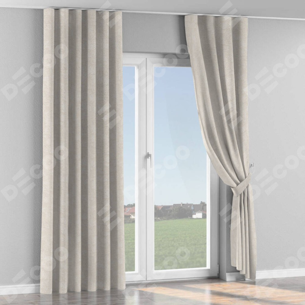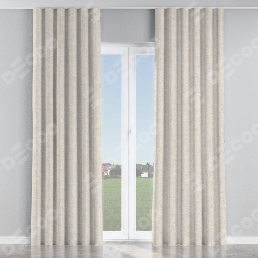 Комплект прямых штор, от производителя «Cortin», пошиты из ткани софт мрамор кремовый, артикул ткани 93574. С изнаночной стороны в верхней части штор пристрачивается шторная лента с декоративными складками «Волна». Для создания элегантных складок прямые шторы шьются по стандарту с коэффициентом 1:2 (на 100 см. ширины проёма 200 см. ширины ткани).