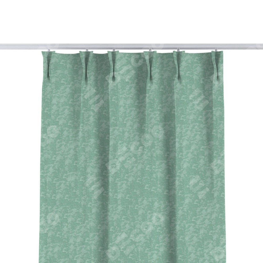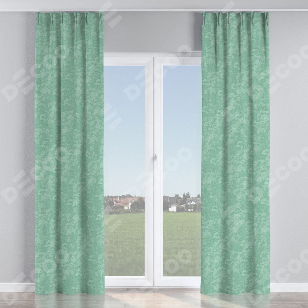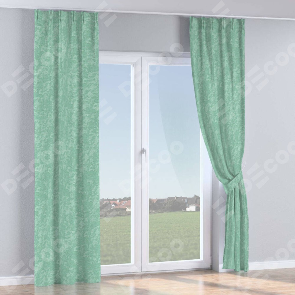 Комплект прямых штор, от производителя «Cortin», пошиты из ткани софт мрамор светло-зелёный, артикул ткани 93579. С изнаночной стороны в верхней части штор пристрачивается шторная лента с декоративными складками «Кустик». Для создания элегантных складок прямые шторы шьются по стандарту с коэффициентом 1:2 (на 100 см. ширины проёма 200 см. ширины ткани).