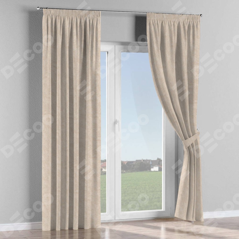 Комплект прямых штор, от производителя «Cortin», пошиты из ткани софт мрамор шампань, артикул ткани 93575. С изнаночной стороны в верхней части штор пристрачивается шторная лента с декоративными складками «Карандаш». Для создания элегантных складок прямые шторы шьются по стандарту с коэффициентом 1:2 (на 100 см. ширины проёма 200 см. ширины ткани).