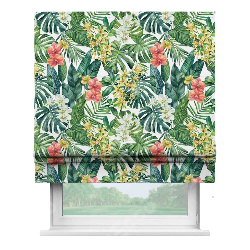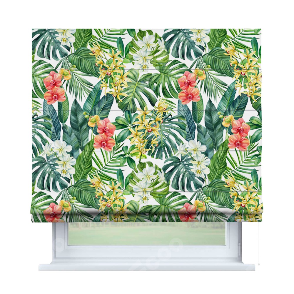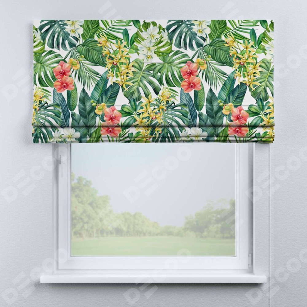 Классическая римская штора производителя «Cortin», пошита из ткани блэкаут с нанесением сублимационной печати «Орхидеи в тропиках». Имеет универсальный механизм и подходит для монтажа: на потолок, на стену и в нишу.